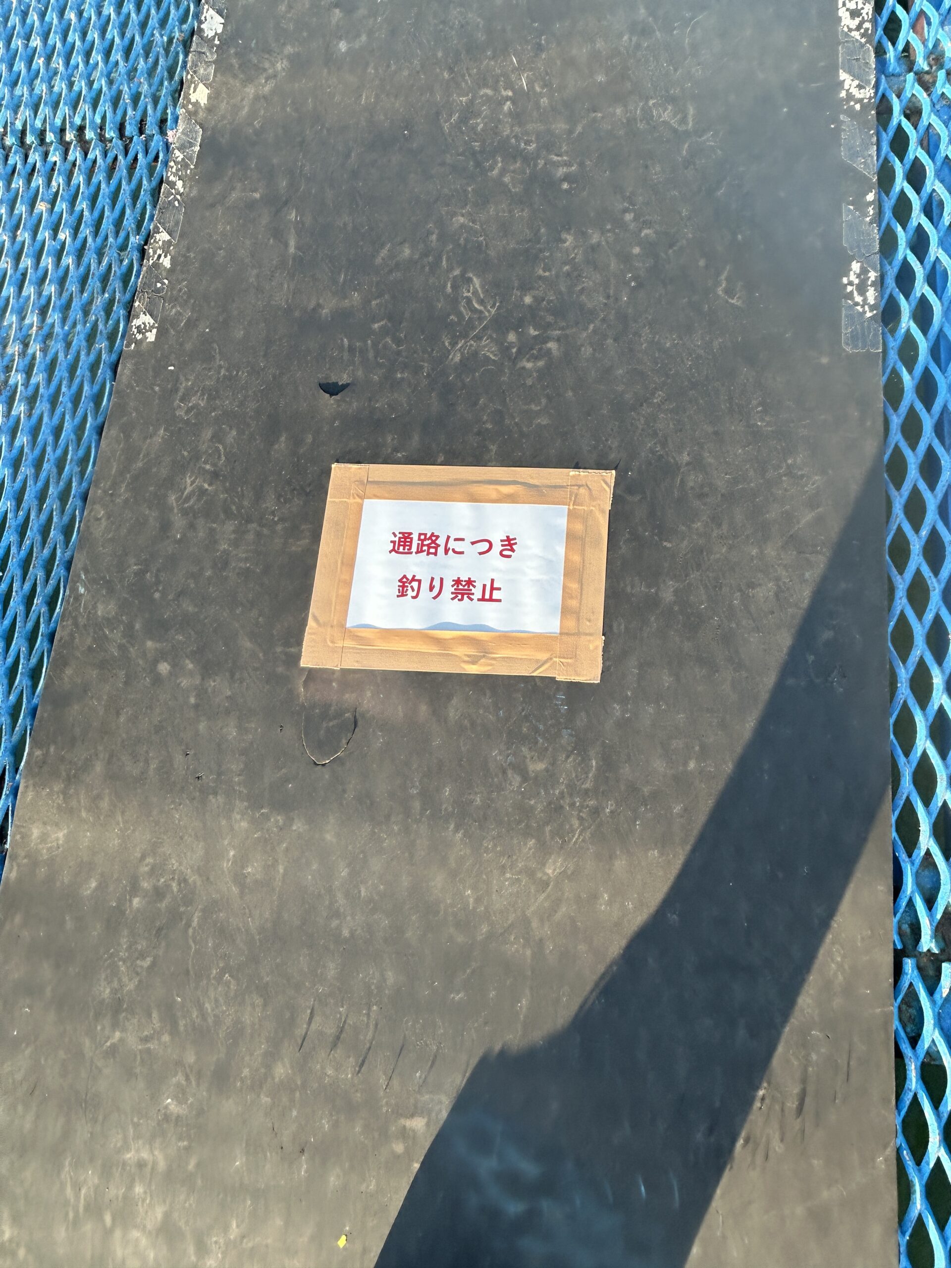 釣り禁止の個所は、ゴムマットを敷いて、「通路につき釣り禁止」の表示をしておりますので